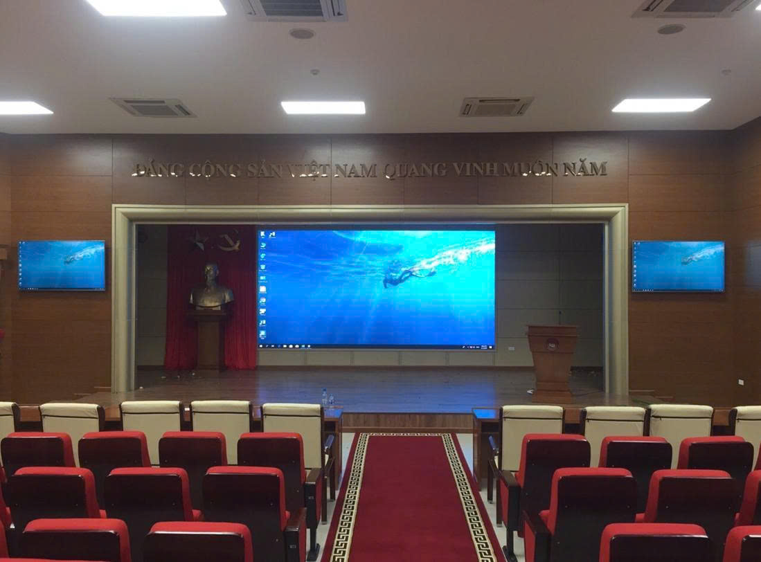 Mô tả: màn hình LED fullcolor trong nhà tại hội trường lớn, gần 12m2, độ phân giải cao, đồng bộ cho phép trình chiếu các sự kiến, hội họp trực tuyến